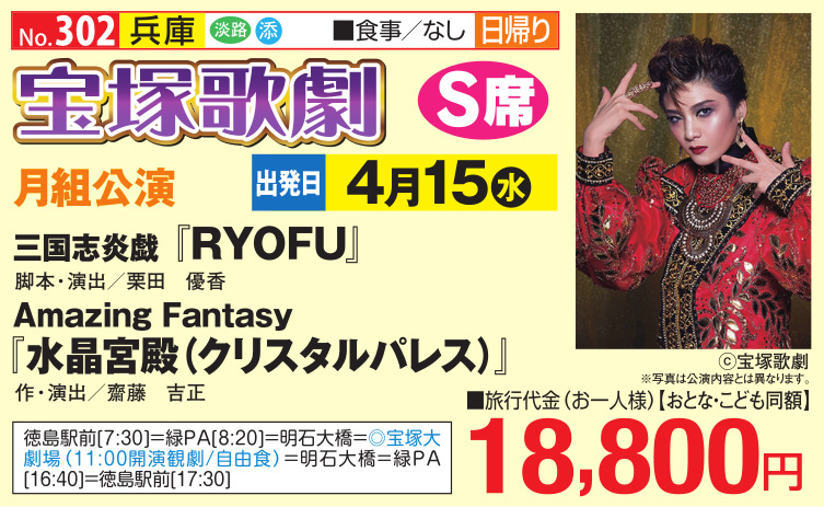 徳島駅前[7:30]=緑PA[8:20]=明石大橋=◎宝塚大劇場(11:00公演観劇/自由食)=明石大橋=緑PA[16:40]=徳島駅前[17:30]